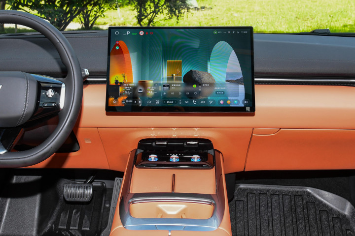 而从车辆外观进入到车内,内饰部分给人的第一印象是精致、简约等特性,这也是当下国产新能源车型的优势所在,内饰设计精致豪华,简约而不简单的设计属性为车辆带来满满的档次感,而且深蓝L07的内饰设计风格更加细腻有质感,搭配15.6英寸的向日葵屏,以及55英寸AR-HUD全息式增强现实系统,能够更加直观的了解到车辆信息,同时搭载高通第四代数字座舱平台产品(高通骁龙8295P芯片),凭借强悍的AI运算能力与多任务处理性能,车机交互实现“零延迟”丝滑体验,而且车机系统的UI也进行的从新设计,无论是从流畅度还是功能性方面均有良好的表现形式,带来更加智能化的用车体验。